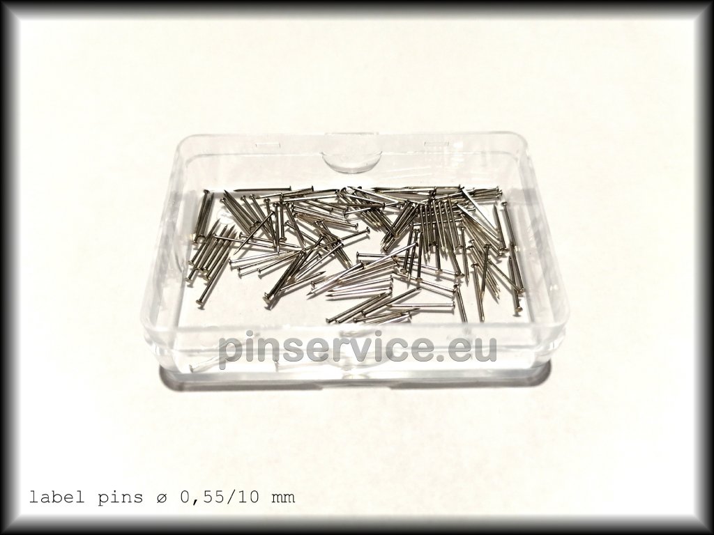 Label pins with flat head, diameter 0,55, length 10 mm.